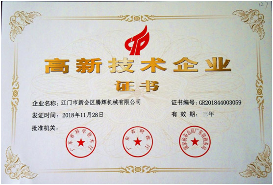 一直以來江門市新會區騰輝機械有限公司堅持勇于創新,突破常規,永不止步,敢于研發的精神,在全體員工的努力下本公司獲得“高新技術企業”。感謝政府對我們企業的技術認可與支持,將來我們公司繼續堅持技術創新為廣大的金屬成型生產企業降低生產難度,增加生產效率。